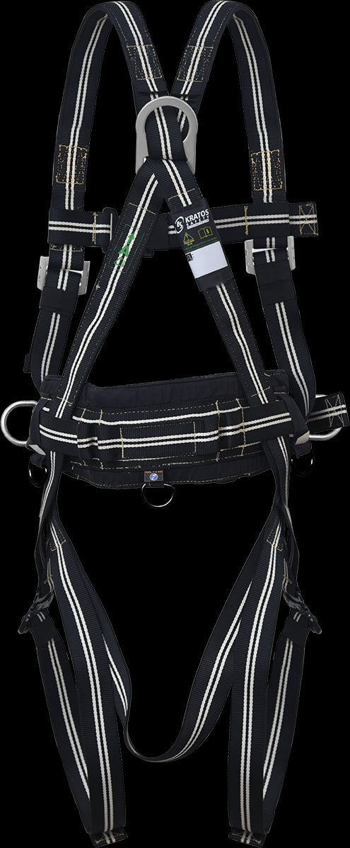 Attachment Elements - 1 dorsal D-Ring, 2 chest attachment textile loops for fall arrest and 2 lateral D-rings at waist level on both sides for work positioning.